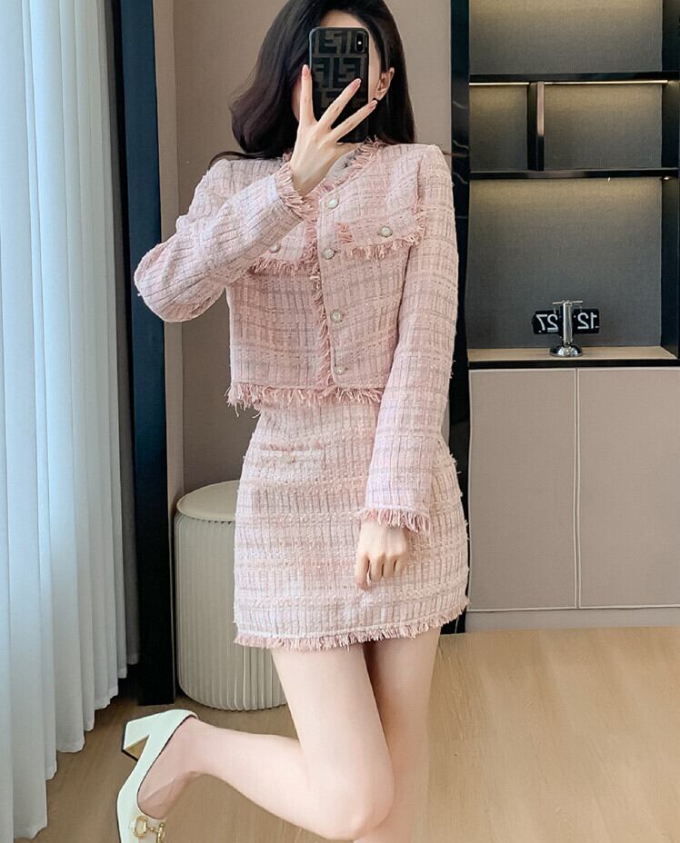 おしゃれなツイードジャケットとミニスカートの2点セットが登場!洗練されたデザインが特徴のこのセットは、フォーマルな場面からキャバドレスまで幅広く活用でき、あなたの魅力を引き立てます。ツイード素材が高級感を醸し出し、着痩せ効果をもたらす優れたシルエットがポイントです。ジャケットはすっきりとしたラインで体型を美しく見せつつ、スカートはミニ丈で華やかさをプラス。自信を持って様々なシーンで着用できる一着です!